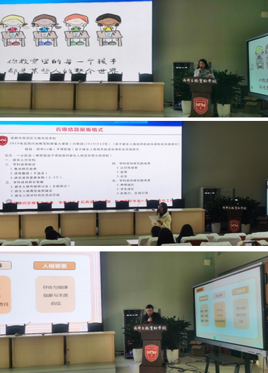 随后谢冬琴老师就道德与法治组本期健全人格课题研究内容和思考进行了经验交流。谢老师先分享了本期的研讨主题《学科微课题与健全人格教育的有机结合》的具体做法,从“探索健全人格教育与学科微课题有机结合的新路径”;“结合学生生理和心理特点及情感需要”;“以前期磨课、中期听课和后期总结反思”三个方面进行了分享。接着谢老师分享了道德与法治组“以课题研究为推力,促进学科教师教育理念与方法多元化,进而提升教师专业技能”的具体做法及“与秋天拥抱,与快乐同行”健全人格活动月的学科特色相关活动,并从课题研究中教师的专业成长,在各级赛课、论文取得的优异成绩进行了交流展示。