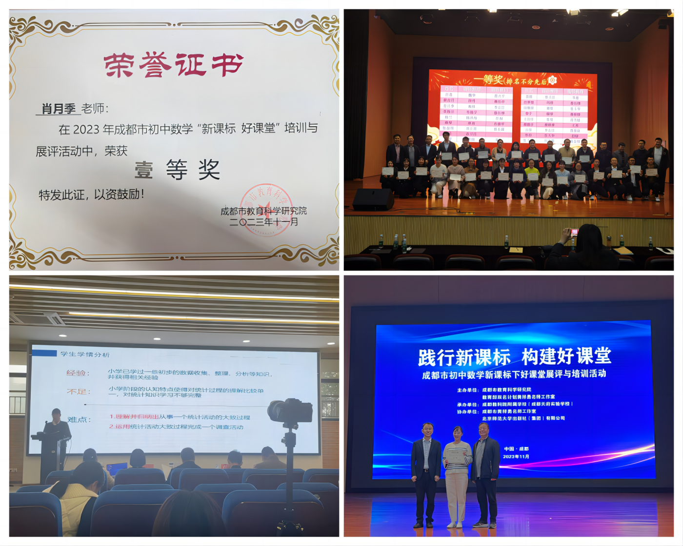 2023年11月,在成都市教育科学研究院组织开展的“践行新课标,构建好课堂”初中数学好课堂展评活动中,我校初中部肖月季老师荣获成都市初中数学赛课一等奖。