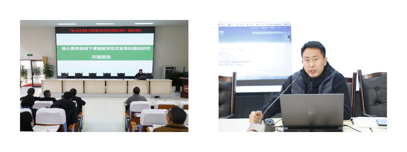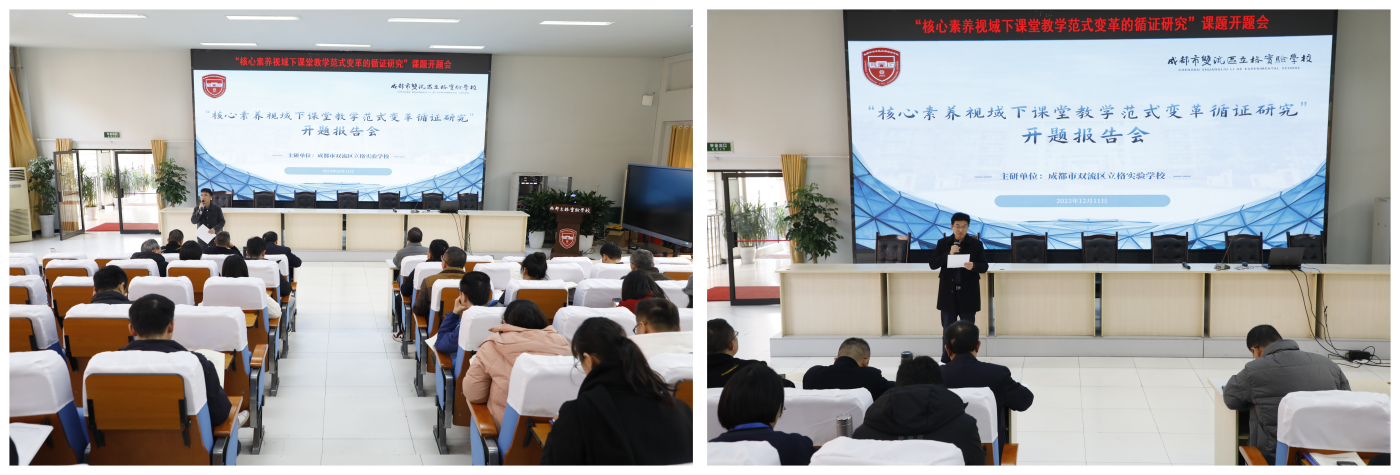 成都立格实验学校于2023年12月11日下午在学术厅举行“核心素养视域下课堂教学范式变革的循证研究”课题开题会。会议由教科室副主任付兵主持,出席人员有学校领导、课题组成员、各学科教研组长、备课组长、各课题组组长、名师工作室导师等。此次会议的重点是探讨如何开展核心素养视域下课堂教学范式变革的循证研究。
