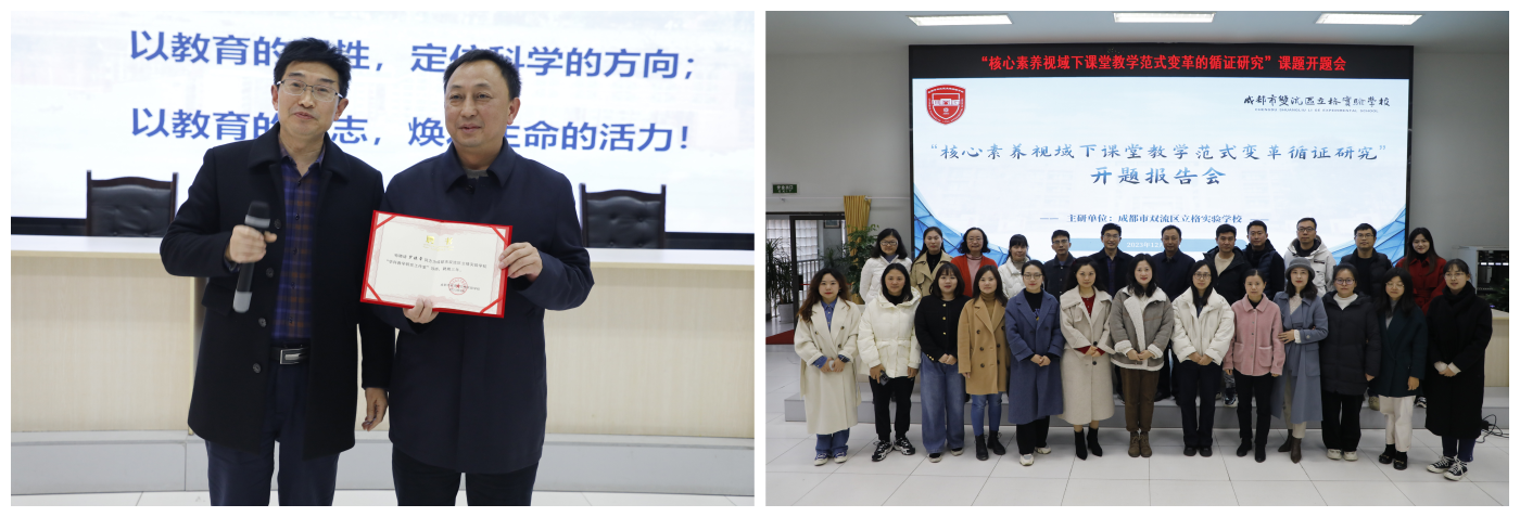 首先,教科室文传福主任宣读课题立项通知,批准成立“学科教学范式循证研究”课题组。课题组的正式成立标志着成都市双流区立格实验学校在推进核心素养视域下课堂教学范式变革方面的重要进展。成都立格实验学校在教育改革和教学实践中落实新课程标准和教学理念迈出了坚实一步。