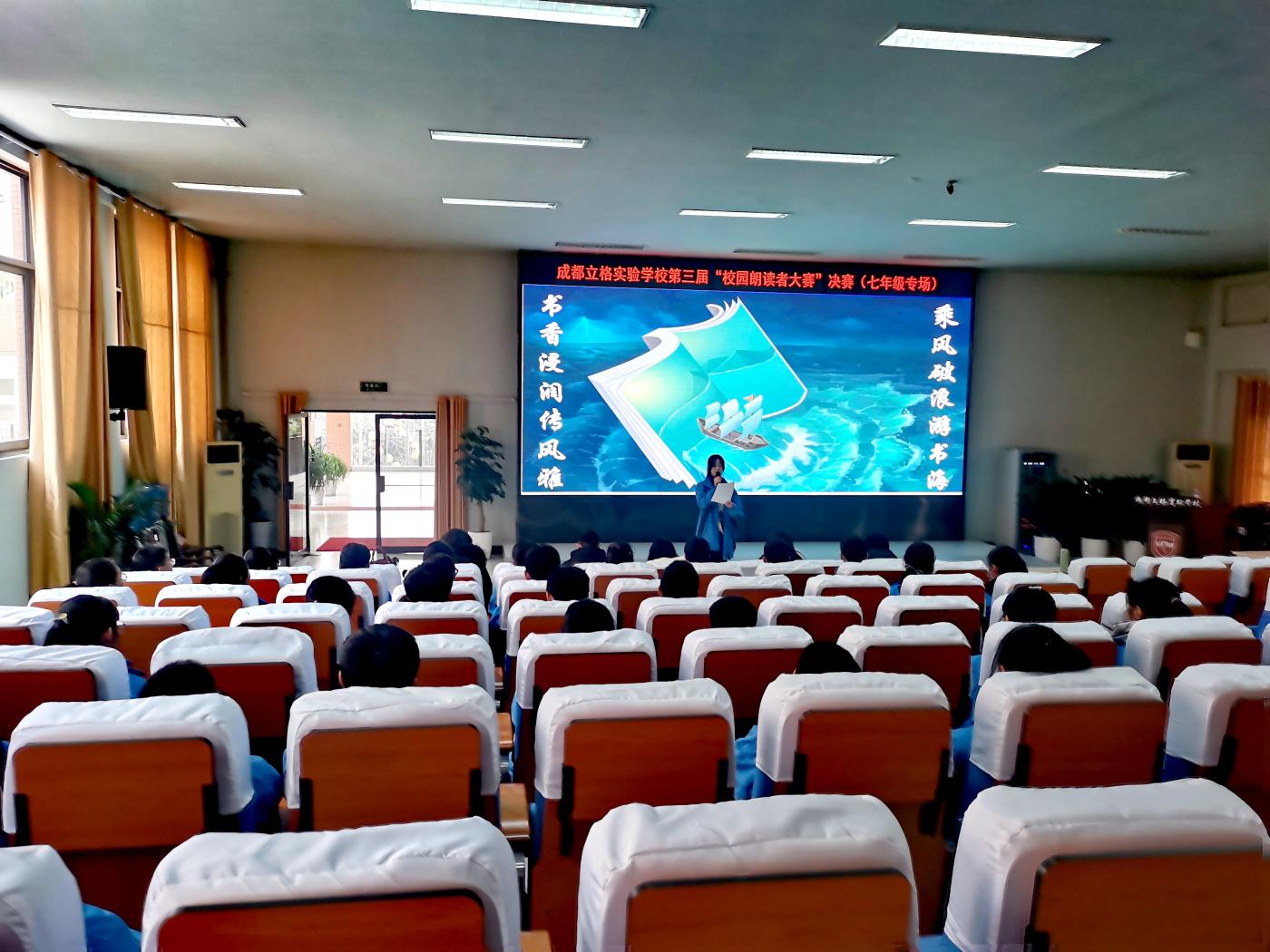 此前两周,七年级19个班利用语文活动课各自举行了班级初赛,如多轮朗诵淘汰制、投票选举、自荐PK相结合等等,选拔形式多样,学生热情高涨。最终选拔出文创班前4名、其余班级级前2名共计42名同学进入决赛。