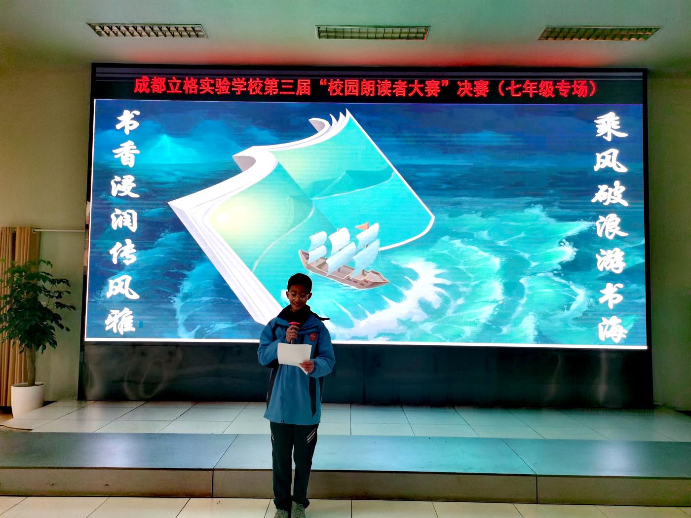 2023年12月27日下午,立格实验第三届“校园朗读者”大赛决赛(七年级专场)在学术厅举行,邀请到行政办孙久木主任、语文教研组组长宋扬老师、文创班班主任杨燕老师、八年级备课组长张薇老师、语文名师工作室刘端老师、文创班备课组长谢娟老师担任嘉宾评委。