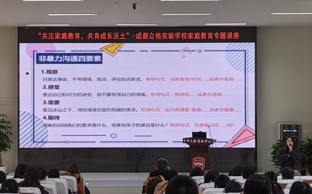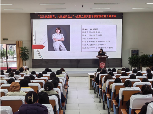 2024年1月23日下午,我校200多名八年级部分学生家长在学术厅参加了一场生动的家庭教育专题讲座。本次讲座由立格实验学校德育处组织,邀请了双流区家庭教育讲师团讲师——向婷婷老师为嘉宾,进行了《聚焦有效亲子沟通,构建和睦亲子关系》的专题讲座。向婷婷老师是西南大学心理学硕士,国家二级心理咨询师,成都市心理健康教育A证学员,双流区人民检察院心理顾问,双流艺体中学心理健康教育教师。