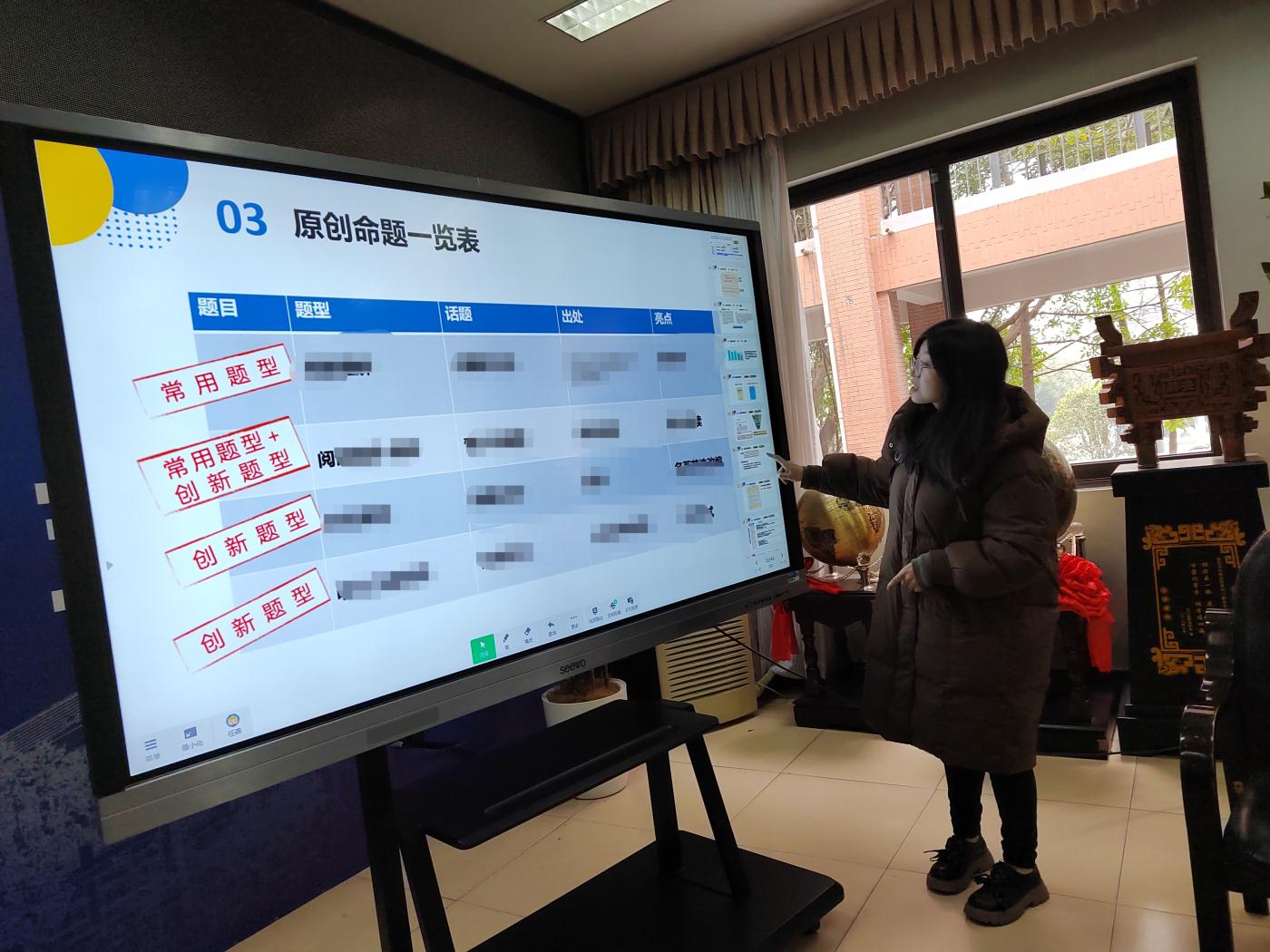 九年级备课组长任燕老师先分享了他们参加双流区《依据课标关键词 中考创命原题》比赛的课件和后期复习计划。据任组长介绍,本次比赛要求在四个关键词----语言能力、思维品质、文化意识、学习能力中选择两个,依据新课标深刻分析中考原题,创命常用题型和创新性题型。在后期教学中,他们计划做四轮总复习,立足课本、主题和专题,扎扎实实的备战中考。