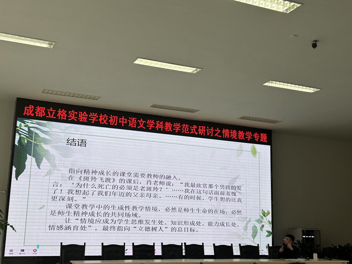 2024年4月18日,立格实验学校语文教研组于学术厅举行了一场别开生面的初中语文情境教学探讨会。会议邀请了语文组教研组长、教科室副主任付兵老师担任主讲,罗晓章副校长、行政办孙主任以及初中语文组全体教师参加了此次会议。