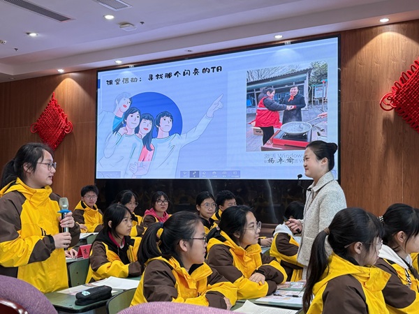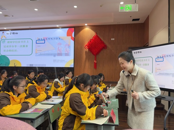 在课前,熊老师对学生进行调查问卷,收集了学生在社会服务中的照片与影像资料,充分把握了学情,创设了上课的情景素材。在此基础上,教研组集全组智慧精心设计和打磨,形成了课堂三个环节。第一环节:萤烛末光,增辉日月。此环节结合课前问卷,通过学生任务卡填写和分享、寻找班级服务社会的典型人物,让学生了解到服务社会的方式和意义。第二环节:不啻微芒,造炬成阳。此环节熊老师通过分享学生王菀洁同学参与社会服务活动的案例,结合我校学科微课题设计课堂小组探究活动,让学生深刻理解了服务社会中遇到的困难应该如何解决。最后一个环节:盈盈星光,奏响华章。通过课后作业布置与中国青年志愿者案例,让学生学有所悟,服务社会的每一次微小举动,都是责任的担当,使命的担当,都是在为实现中国梦助力。从而使课堂的高度得到了有效提升,更好体现了道德与法治学科立德树人的课程目标。
