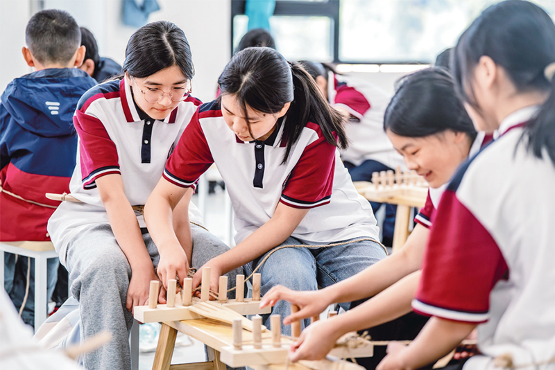 近年来,各地立足当地红色文化资源优势,组织学生以红色旧址遗迹为“教室”,以文物史料为“教材”,开展“行走的思政课”主题教育活动。图为2025年5月12日,云南省昭通市威信县第一中学学生在红色研学实践基地体验编织草鞋,在实践互动中重温红色革命历史。 (新华社记者 胡超/摄)