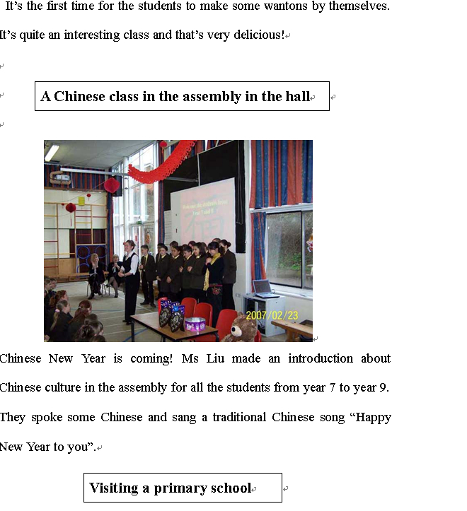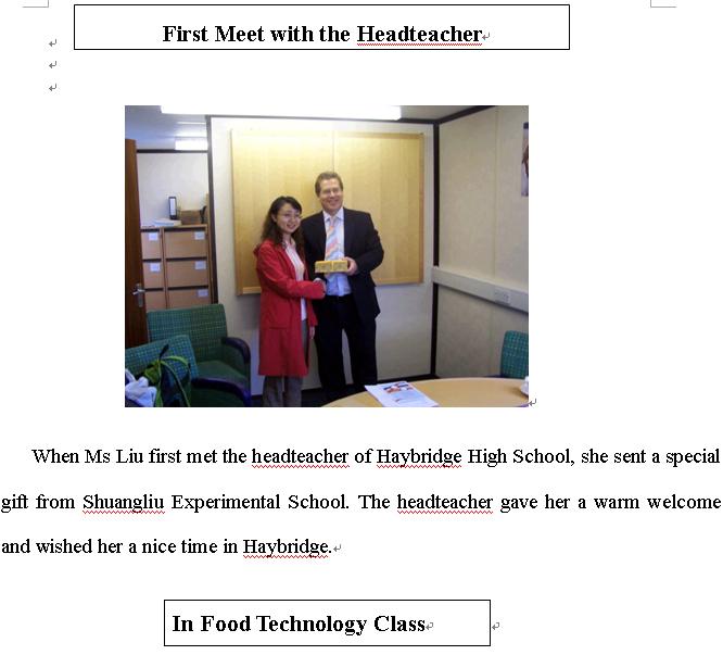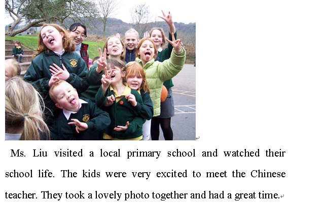 我校英语教师刘意佳、欧英、王华、曾艳和周淼分别于2006年9月-2007年6月,2007年9月-2008年6月,2008年9月-2009年6月,2009年9月-2010年6月,2010年9月-2011年6月在英国友好学校海布里奇中学执教中文。因为她们的努力,海布里奇中学的第二外由德语改成了中文,掀起了中文热!在当地留下了深远的影响.