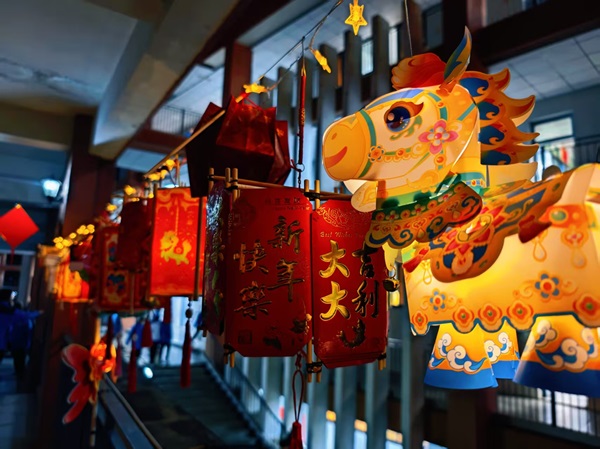 每一盏灯都凝聚着孩子们的巧思。不少灯笼内置了小彩灯,柔和的灯光透过彩纸洒落,将廊道映照得温暖而喜庆。微风吹过,灯穗轻摇,光影浮动,节日氛围扑面而来。师生们流连其间,驻足欣赏,在光影交错间感受着文字与艺术的魅力。