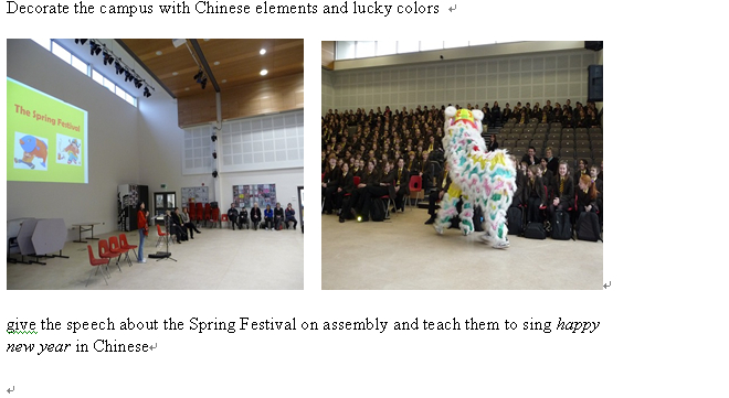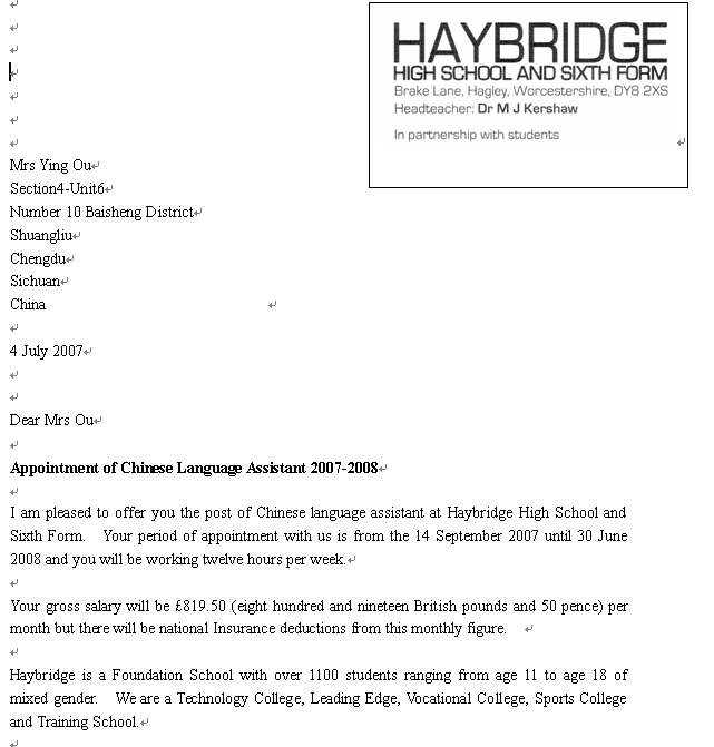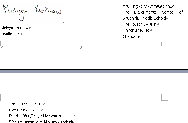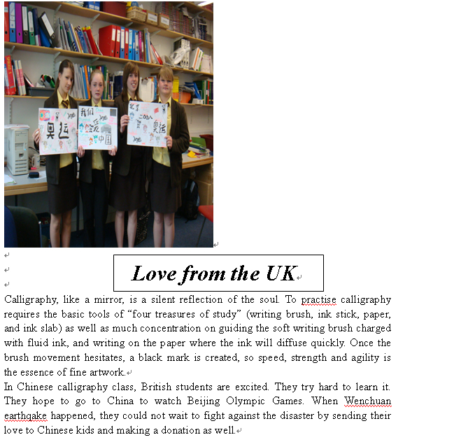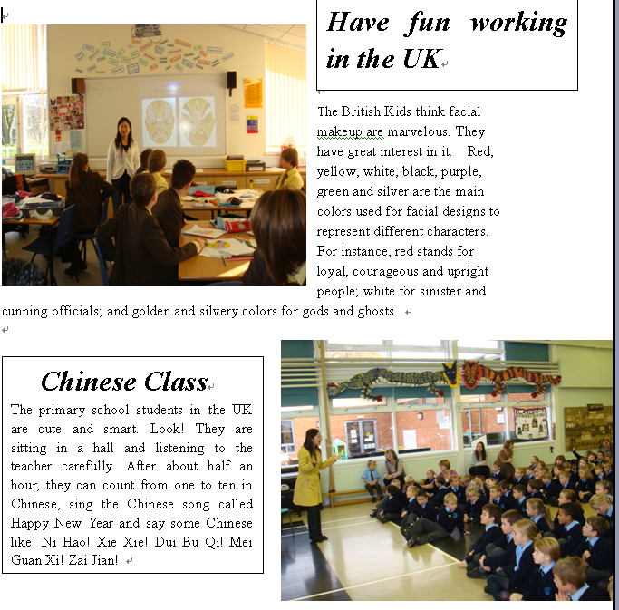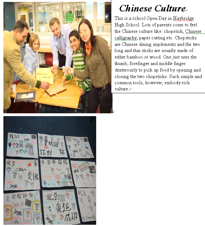 我校英语教师刘意佳、欧英、王华、曾艳和周淼分别于2006年9月-2007年6月,2007年9月-2008年6月,2008年9月-2009年6月,2009年9月-2010年6月,2010年9月-2011年6月在英国友好学校海布里奇中学执教中文。因为她们的努力,海布里奇中学的第二外由德语改成了中文,掀起了中文热!在当地留下了深远的影响.