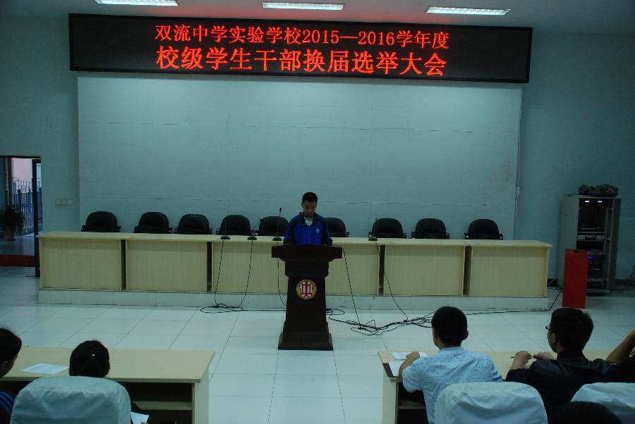 2015年9月29日晚6:20,我校在学术演讲厅举行了2015—2016学年度校学生干部换届选举大会。本次大会的评审团由德育处王敏蓉副主任、学生工作组王俊老师、刘家佚老师、黄德洪老师和吴益锋老师以及七八九年级校级学生干部组成。此次大会,全程秉承着“公平竞争,德才兼备”的原则。整个选举过程庄严肃穆,评审员都十分认真专注的评分。