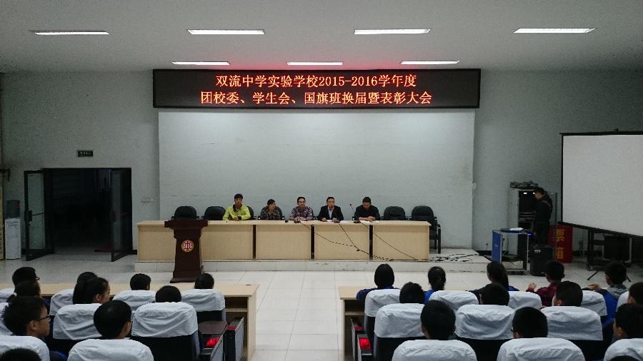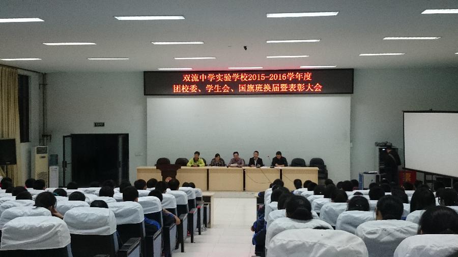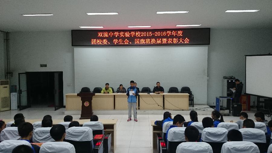 金秋十月,硕果飘香,2015年10月29日晚,双流中学实验学校学术演讲厅灯火辉煌。全校新老团校委成员、学生会干部、国旗班队员和七八年级班长支书齐聚一堂,共同见证双流中学实验学校2015——2016学年度团校委、学生会、国旗班换届表彰大会。本次大会得到了学校领导和德育处老师高度重视,双流中学实验学校常务副校长张润林,双流中学实验学校德育处王敏蓉副主任,德育处学生工作组组长王俊老师,德育处学生工作组吴益锋老师、刘奕老师、刘家佚老师、黄德洪老师参加了此次大会。大会由学生工作组组长王俊老师主持。