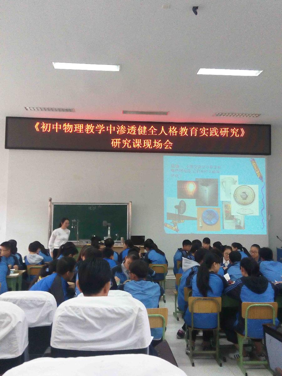 2015115,我校《初中物理教学中渗透健全人格教育实践研究》阶段成果汇报在学术厅举行,张校长到场参加。首先由物理组韩媛媛老师上了一堂课题展示课——《电功》。这堂课首先学生熟悉的机械功引入,让学生对比理解电功,通过思考家用电器工作时能量事怎么转化的开展学生活动,充分调动了学生的积极性,进一步激发学生想要理解电功实质的兴趣。通过演示用电器短时间工作,电能表的示数无变化,启发学生思考如何测量用电器消耗的电能,培养了学生的创新精神和探究精神。最后通过学生讨论一度电的用处、如何节约用电,把整堂课推向了高潮。这堂课通过韩媛媛老师的精心设计和准备,将健全人格教育渗透于整个教学过程中。
