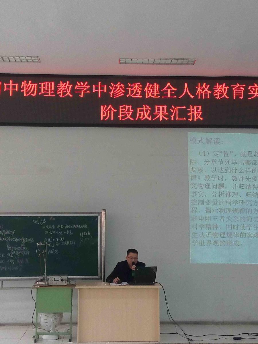 最后,由罗远洋老师代表我组进行了开展了《初中物理教学中渗透健全人格教育实践研究》阶段成果汇报。罗老师从该课题的研究目标、研究方向、研究措施和途径、阶段成果和效果、研究存在的主要问题、下阶段研究重点等方面进行了详细的阐述,确定了课题组在下阶段进行理论探讨和实证研究的方向。(物理组  刘曦萍)