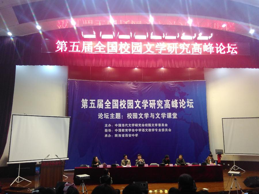 2015年11月6日至7日,由中国当代文学研究会校园文学委员会主办、中国教育学会中学语文教学专业委员会指导、陕西省西安中学承办的第五届全国校园文学研究高峰论坛暨全国校园文学成果展览会,在西安成功举办。著名文学评论家、中国当代文学研究会会长白烨,著名语文教学专家、中国教育学会中学语文教学专业委员会理事长、人民教育出版社语文教材编审顾之川,著名语文教学专家、中语会副理事长、中国教育科学研究院教授张鹏举,著名作家、陕西省文联副主席、陕西省作家协会副主席高建群,著名作家、陕西省作家协会副主席红柯,中国少年儿童新闻出版总社编审、叶圣陶孙女叶小沫,陕西省教学科学研究所所长李振东,陕西省西安中学校长、特级教师张克强,中国当代文学研究会校园文学委员会常务副会长、中语会理事王世龙以及来自全国各地的中小学校长、教师、教研人员300余人出席了本届论坛。