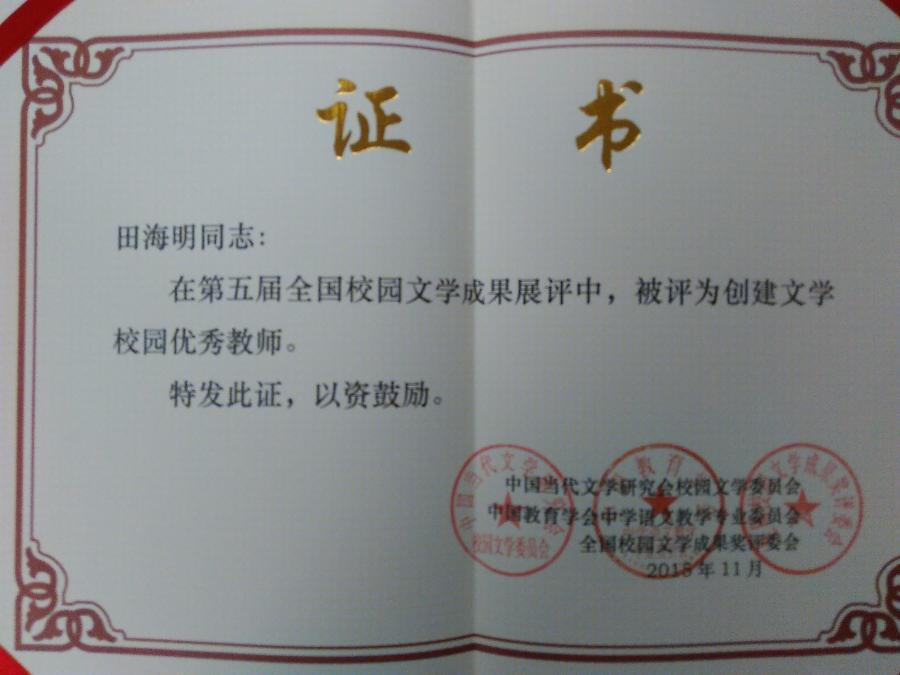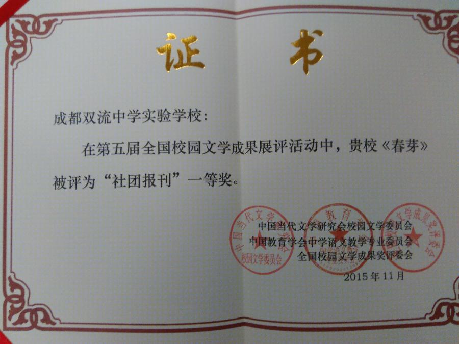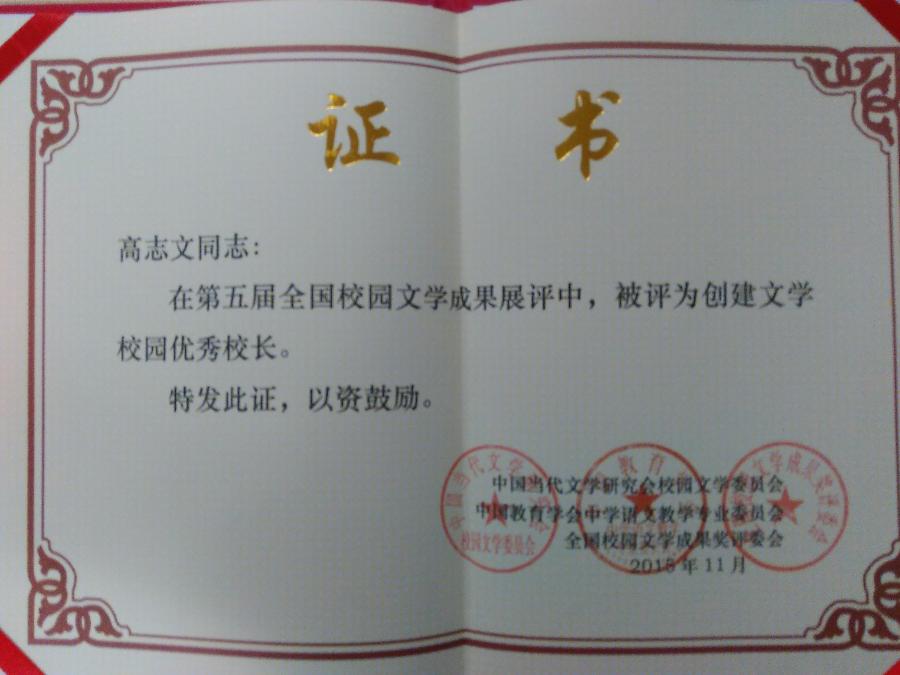 我校在本次评比活动中,被评为“全国优秀文学校园”,春芽文学社社刊《春芽》被评为“社团报刊”一等奖。高志文校长被评为创建文学校园优秀校长,田海明老师被评为创建文学校园优秀教师。(语文组 田海明)