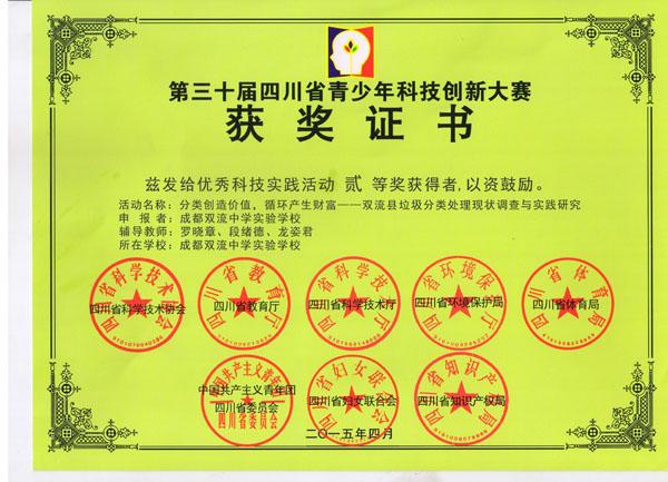 2015年4月,在第三十届四川省青少年科技创新大赛中,我校罗晓章、段绪德和龙姿君三位老师辅导的实践活动 《分类创造价值,循环产生财富———双流县垃圾分类处理现状调查与实践研究》荣获优秀科技实践活动省二等奖。