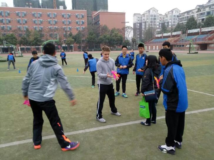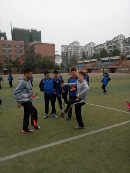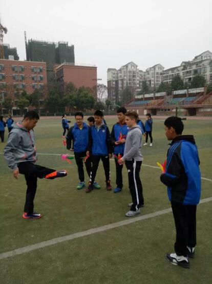 Eddie与八年级2班的同学一起上体育课,学习古老的汉族民俗体育项目——踢键球