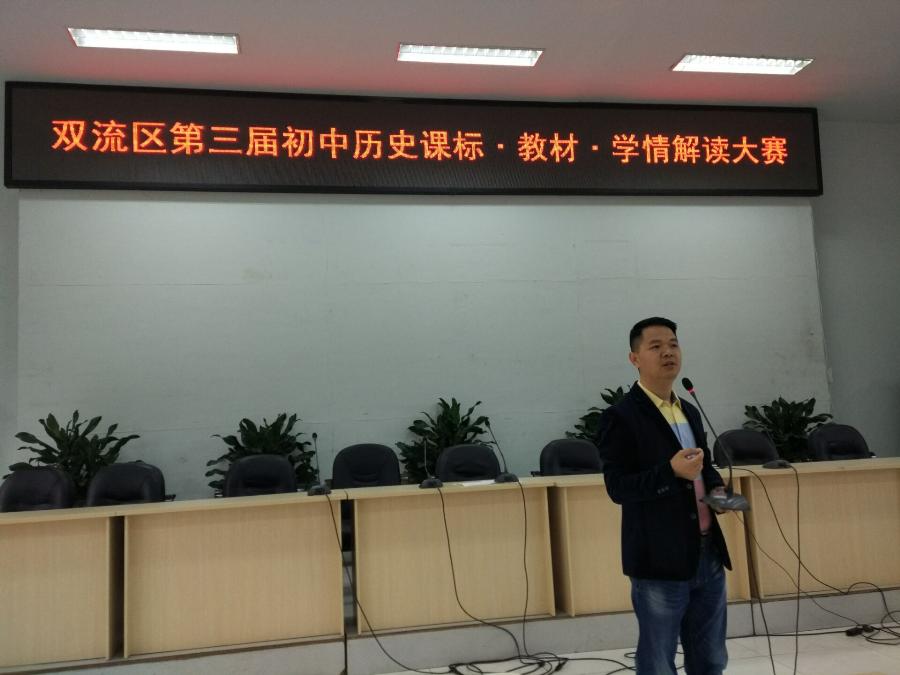 教师素质是实施课程改革、推进素质教育的关键。为了进一步加强我区历史教师师资队伍建设,提升各历史教师对于教材的理解运用能力,全面有效提高课堂教学质量,双流区第三届初中历史教材解读大赛于4月15日在我校学术厅进行。