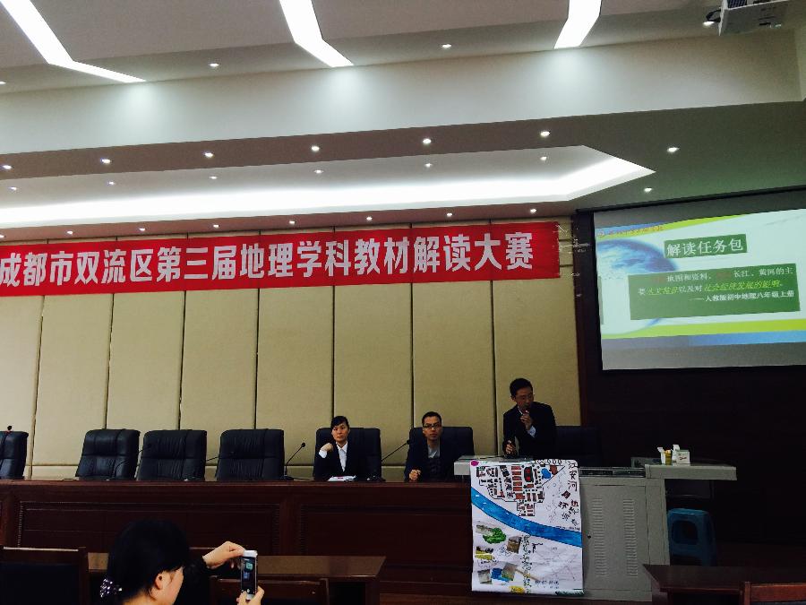 本次比赛全区初中学校都做了充分的准备,比赛分为两部分,比赛当天现场抽签决定比赛的具体任务包和比赛学校,上午为七年级任务包抽签比赛,下午为 八年级任务包抽签比赛,通过抽签共有八所学校被抽中,分别是:(七年级)金桥中学、东升一中、棠湖中学实验学校、东升二中(八年级)双流中学实验学校、棠湖中学、西航港一中、棠湖中学外语学校,更有西航港二中主动展示。王俊、欧波和向敏老师作为我校八年级代表参加了解读《运用地图及其他资料,阐述某区域自然环境特点对生产生活的影响》。