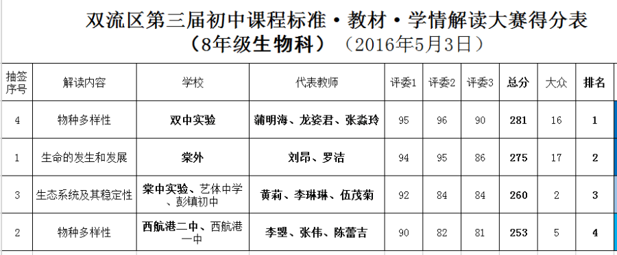 我校八年级蒲明海、龙姿君、张淼玲三位老师精心准备了三个比赛任务包,在抽签的第一次就被选中。分别抽中的学校有双流中学实验学校、棠湖中学外国语学校、西航港二中和棠湖中学实验学校。按照顺序抽签我们学校作为第四支团队参加了比赛。在解读过程中,他们从整体课标、教材分析、学情分析、教学策略和课例分析几个环节出发,结合我校八年级学生的实际情况,再结合具体课例《物种的多样性》进行了解读。整个过程由高至下、由理论到实际,深度解读了生物课程标准,并展示了我校教师的良好素质,受到评委专家及全县老师的一致好评;并获得了本次比赛第一名的好成绩。