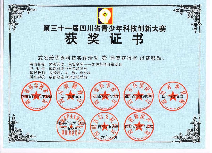 20164月,在石室天府中学举办的第三十一届四川省青少年科技创新大赛中,我校龙姿君、向敏和李举梅三位老师辅导的科技实践活动 《体验劳动,积极探究——走进彭镇种植基地》荣获优秀科技实践活动省一等奖。现已被推荐并申报第三十一届全国青少年科技创新大赛。