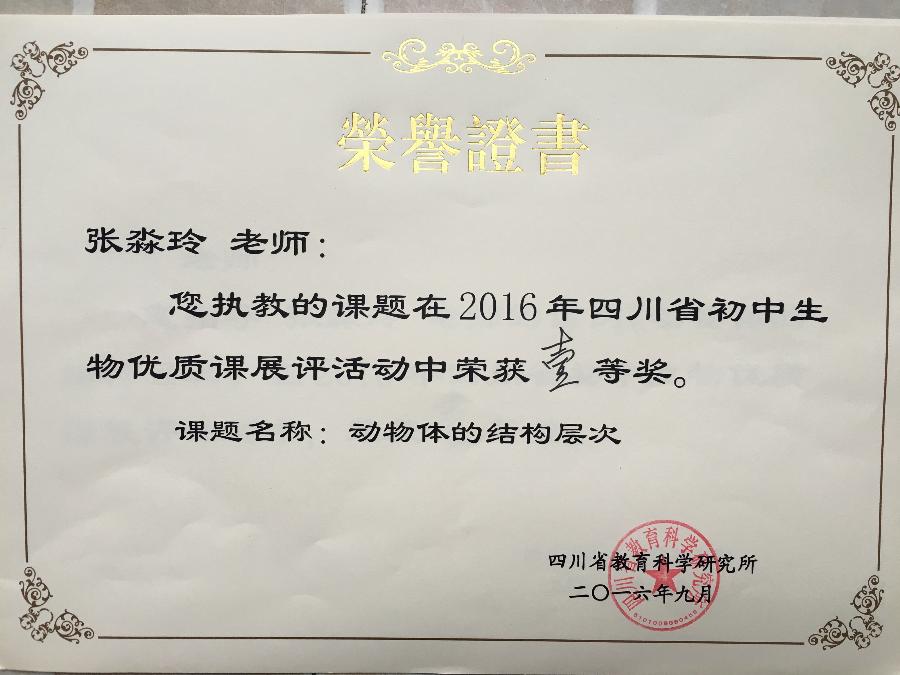 张淼玲老师在2016年省初中生物优质课展评活动中获省一等奖