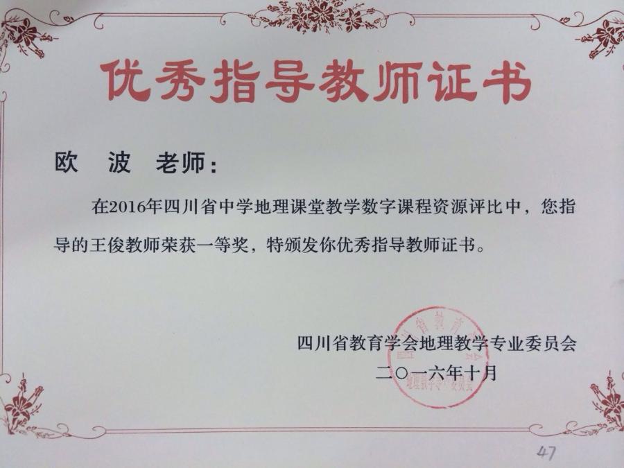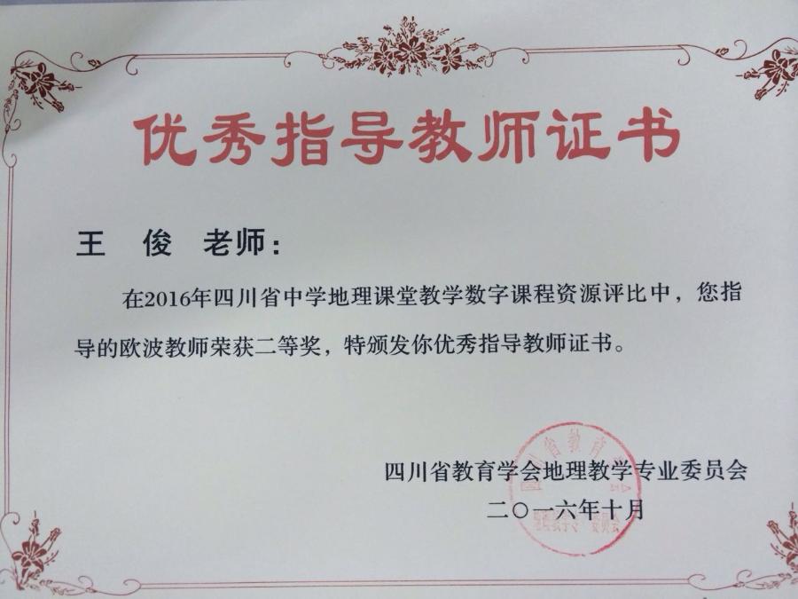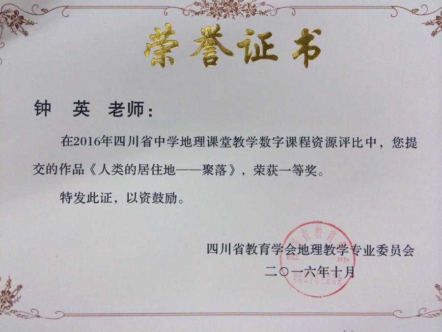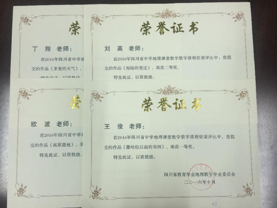 在中国教育学会地理教学专业委员会主办的2016中学地理课堂教学数字课程资源活动的倡导下,遵循四川省教育学会地理教学专业委员会的活动规则,我校地理组全体教师积极参与,荣获四川省中学地理课堂教学数字课程资源评比奖项10余项。其中王俊老师的课程资源《撒哈拉以南的非洲》与钟英老师的《人类的居住地——聚落》以创新的课件,新颖的教学环节,老师的专业素质均荣获一等奖,欧波、钟英、王俊均获最佳指导教师奖。