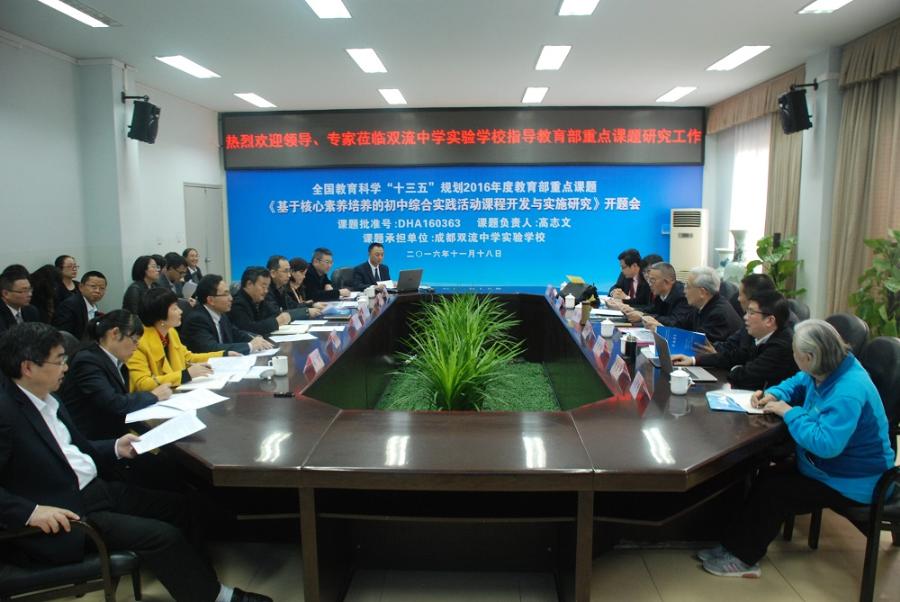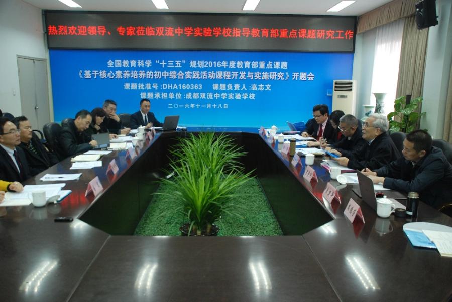 2016年11月18日,由成都双流中学实验学校独立承担的全国教育科学“十三五”规划2016年度教育部重点课题《基于核心素养培养的初中综合实践活动课程开发与实施研究》(课题批准号DHA160363)在该校隆重开题。首都师范大学教授、中国高等教育学会教师教育分会综合实践活动学科委员会荣誉理事长陈树杰先生,首都师范大学教授、中国高等教育学会教师教育分会综合实践活动学科委员会理事长杨培禾女士,首都师范大学教授、中国高等教育学会教师教育分会综合实践活动学科委员会常务理事尚德荣女士,四川省教育科学研究所所长、国家中小学教育评估专家、四川省人民政府督学刘涛先生,四川师范大学教育科学学院副院长李松林教授,成都大学师范学院教育学学科带头人岳刚德教授,四川省教育科学规划领导小组办公室副主任、四川省教育科学研究所科研管理室主任王真东研究员,成都市教育科学研究院副院长秦建平先生,成都市教科院教育改革发展研究所所长胡燕女士,成都市双流区教育局党组书记、局长李光纯先生,成都市双流区教育研究与教师培训中心主任邱刚田先生,成都市双流区研培中心理论室主任易恩女士莅临开题会并指导。开题会由四川省教育科学规划领导小组办公室副主任王真东研究员主持。