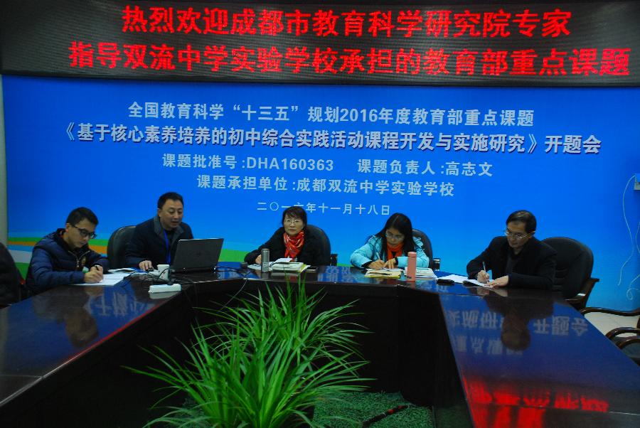 2016年12月28日下午,成都市教育科学研究院罗清红院长、成都市教科院教育改革发展研究所副所长、《成都教育》执行主编、成都市教科院中学综合实践活动教研员史玉老师,成都市教科院中学物理教研员卢山老师、《成都教育》执行副主编肖慧老师和双流区研培中心理论室易恩主任一行莅临成都双流中学实验学校调研指导综合实践活动课程的开发与实施。教育部重点课题《基于核心素养培养的综合实践活动课程开发与实施研究》课题组长、成都双流中学实验学校校长高志文,副校长张润林、教科室文传福主任、教务处周宗友主任、罗晓章副主任和综合实践活动课题组主研人员付兵老师等陪同。