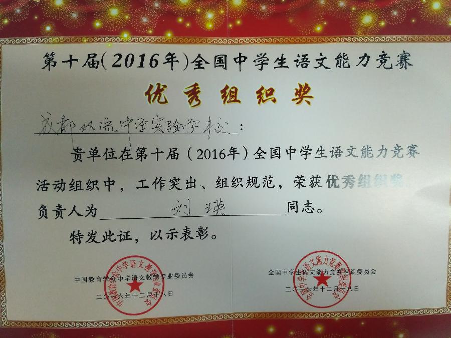 双流中学实验学校语文教研组在本次大赛中荣获优秀组织奖。(语文组 田海明)