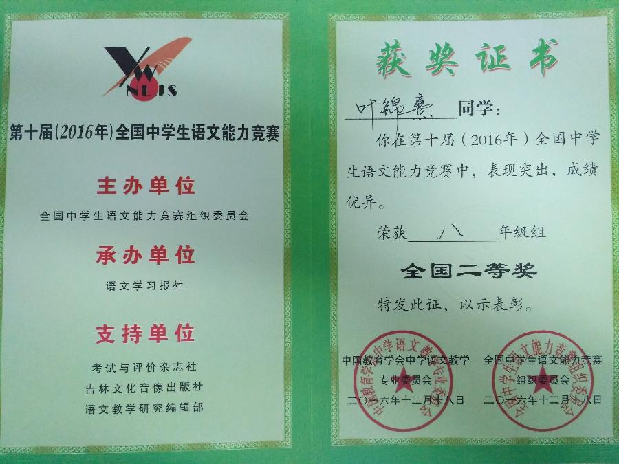 在2016年全国中学生语文能力竞赛中,双流中学实验学校参赛学生喜获佳绩。