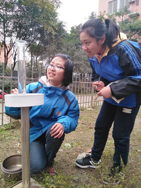 科技实践活动《探知风云变幻,气象服务生活——校园气象观测与探究》源于我校一个小组研究性学习课题——校园气象站研究。课题研究中,学生根据地理、生物、物理、人文、资源、环境等问题,自主提出假设、设计方案、查阅资料、设计模型、调查访问、实验验证、分析数据、得出结论。并通过走进校园气象站,双流区气象局、气象台、气象站,双流区科协,成都信息工程大学气象学院,四川省气象局,现场考察,向专家学习。在校园气象站建设阶段,由课题研究小组结合学校现有条件,自主设计、选址、规划、建设。学生利用绘图软件自己设计绘制校园气象站规划图,利用各种材料自建气象站模型,制作了简易风向仪来观测校园的风向。在校园及周边空气质量调查过程中,学生尝试自主提出用“干净卫生纸擦拭法”、“纯净水静置法”、“透明胶带法”等创新方法进行研究。对采集、观察悬浮颗粒物的工具以及如何准确观察计数进行了改进,达到了预期的良好效果。这些创新举措,及该活动取得的良好社会效益,征服了评委,以全省第一名的成绩获得进军全国比赛的机会。