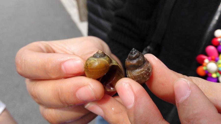 在同学们的辛勤劳作中,不知不觉30分钟已经过去了,而在这短短的30分钟里,组员们在这片面积并不大的水域中抓了大大小小的福寿()螺数个。