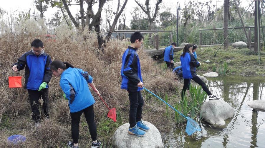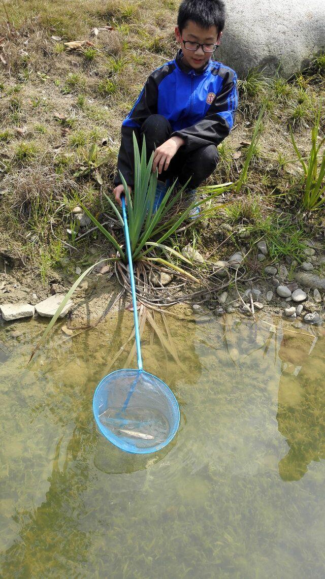 看,当李老师正在观察福寿螺时,我们已经迫不及待地开始抓螺了:谭尧威同学正在用鱼网网螺,其他同学也纷纷加入了抓螺的队伍。