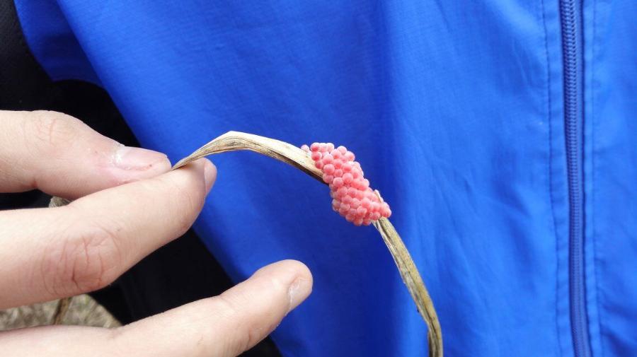 正在他们忙的不亦乐乎的时候,我却在草丛底下“乘凉”,可别以为我在偷懒啊,因为我在草丛里面找到一堆福寿螺产的卵,粉红粉红的。